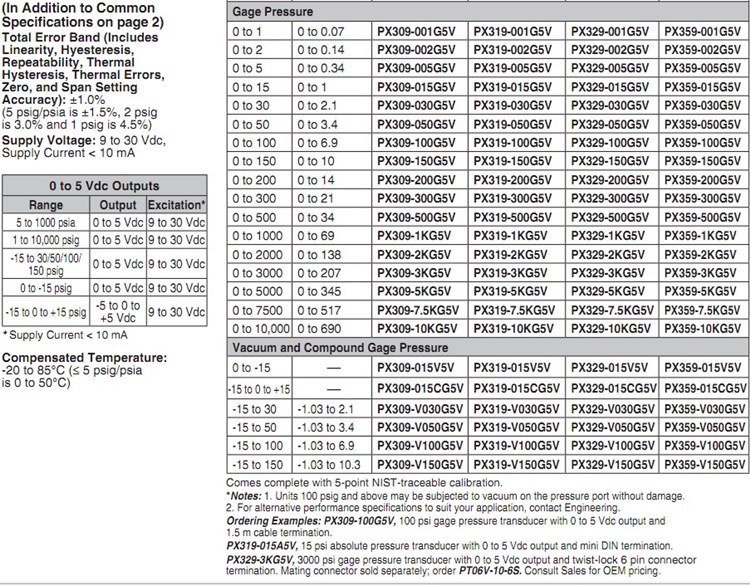 美国奥米佳压力传感器PX309-200G5V,PX309-300G5V,PX319-500G5V
